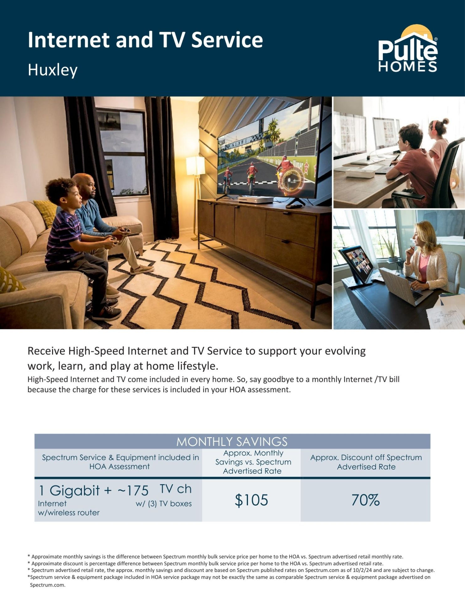 When you call Huxley home, you'll enjoy high-speed internet and TV conveniently included in your HOA fees at a discount you'll love!