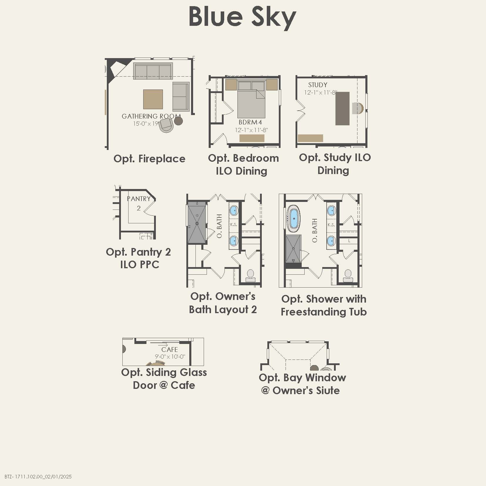 - The popular Blue Sky provides one level of easy living space for families, including a gathering room with optional fireplace and a sunny nook, plus covered rear patio. Culinary enthusiasts will love entertaining in the open gourmet island kitchen.